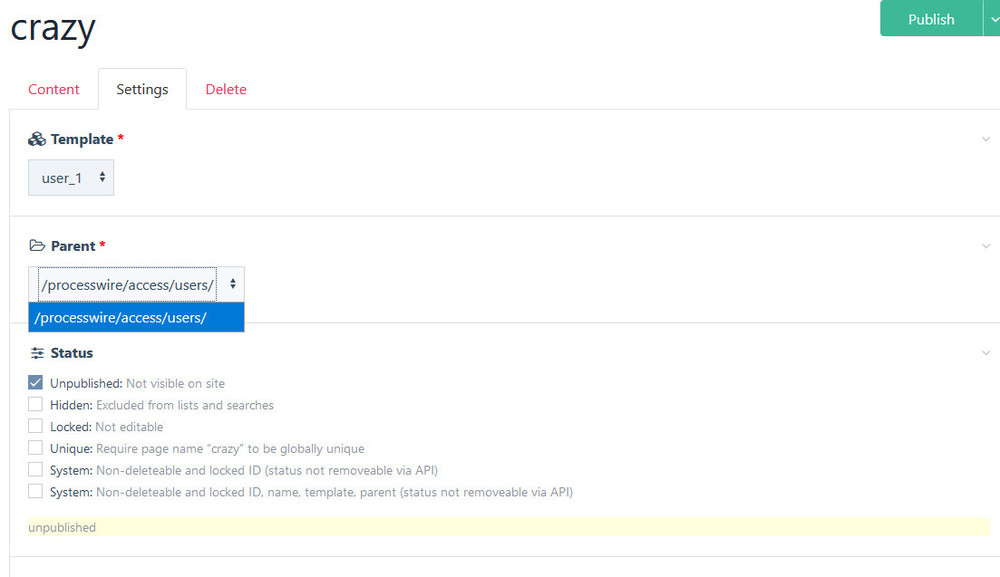 After setting up a new user template using this guide: https://processwire.com/blog/posts/processwire-core-updates-2.5.14/#multiple-templates-or-parents-for-users, the pages are created fine but I can't log in as the newly created user. I did notice that my new template doesn't have a 'name' field like the users in admin/access/users. Is this the field that is checked when logging in? Here is my code that I am using to create the page when someone registers: $np = new Page(); // create new page object $np->template = $templates->get("user-hunt"); $np->parent = $pages->get("/members/"); // Match up the sanitized inputs we just got with the template fields $np->of(false); $np->name = $hunt_name; $np->title = $hunt_name; $np->member_hunt_name = $hunt_name; $np->member_hunt_contact_name = $contactname; $np->member_hunt_position = $position; $np->member_hunt_address = $address; $np->member_hunt_postcode = $postcode; $np->member_hunt_telephone = $telephone; $np->member_hunt_country = $country; $np->email = $email_address; $np->pass = $password; // Save the page $np->save(); $np->of(true); Also, when it creates the page, it's putting the title as the created date/time for some reason. ?