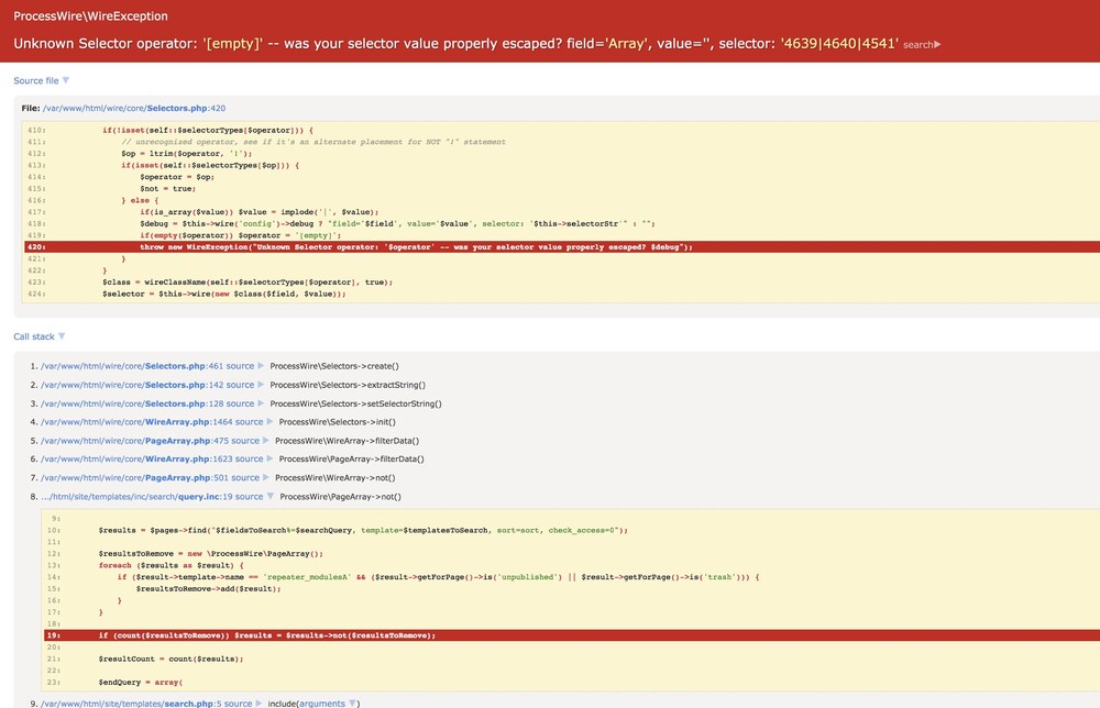 I'm using the selector operator %= when returning search results: $searchQuery = $sanitizer->text($input->get->q); $searchQuery = $sanitizer->selectorValue($searchQuery); $input->whitelist('q', $searchQuery); $fieldsToSearch = 'title|text|textA|textarea|projectsCategories.title|projectsClients.title|aboutPressCategories.title|aboutPressClients.title'; $templatesToSearch = 'projectsSingle|shopSingle|typeSingle|typeCustomSingle|typeCustomSingleB|aboutPressSingle|repeater_modulesA'; $results = $pages->find("$fieldsToSearch%=$searchQuery, template=$templatesToSearch, sort=sort, check_access=0"); However, I'm getting an error: ProcessWire\WireException Unknown Selector operator: -- was your selector value properly escaped? field=, value=, selector: If I change the operator from %= to = then no error is returned but obviously this isn't the ideal operator for what I'm doing. However, to create even more mystery, this error seems only to be returned when using certain words. For example 'house' will return the error but 'houses' won't. So now I'm thinking the error is actually not related to the above but actually to what follows... $resultsToRemove = new PageArray(); foreach ($results as $result) { if ($result->template->name == 'repeater_modulesA' && ($result->getForPage()->is('unpublished') || $result->getForPage()->is('trash'))) { $resultsToRemove->add($result); } } if (count($resultsToRemove)) $results = $results->not($resultsToRemove); $resultCount = count($results); This part is required as I am searching repeater templates using check_access=0 but obviously don't want unpublished repeater rows or trashed repeaters to be returned so I need to do a little check. I think this is maybe where it's breaking but can't know for sure. I'm also unsure why it would break for the search query 'house' but not 'houses'? If I can provide any more info to help me resolve this I can do... just a bit stumped.