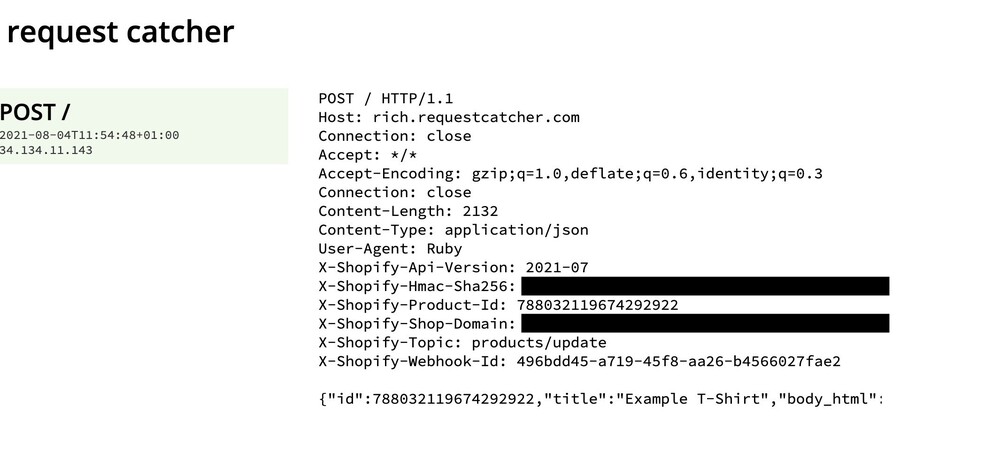 @elabx 4 years ago you posted this and it's still tripping me up! I now have a Shopify webhook firing to /api/ in my PW app when a product is updated. I have verified that PW is getting the response with the following... $log->save('shopifyApi', 'Webhook triggered from Shopify'); Great! The request is a POST request so I'm assuming I use `$input->post()` but I am unsure how to check the headers to see what the X-Shopify-Topic is and also to grab the data? Attached below is the webhook response tested on request catcher...