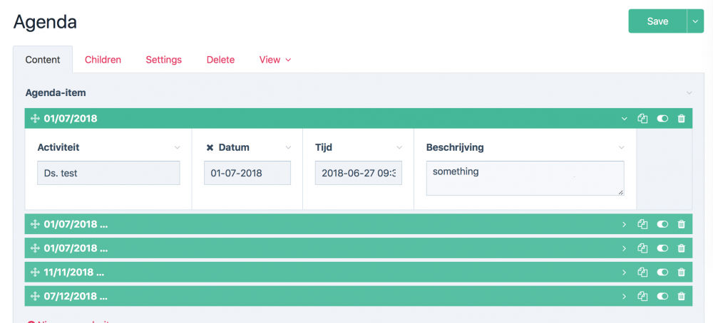 @PWaddict: Thank you, but can I place the code on a different page(homepage)? I tried the following code but it does not work. I added 'get' $upcoming_dates = $pages->get("/agenda")->agendaitem->find("agenda_datum>=$today, sort=agenda_datum, limit=3");