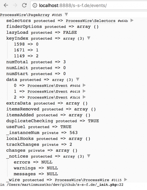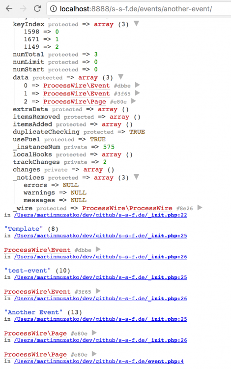 Hello! I started to implement this tutorial today. I am a little stuck with the advanced options. If I load a page, it is not of type Event, but if I get - for example - the next page, it is of type Event. It is always the loaded page, that is not of type Event, but of type Page. I think this is a bug in Processwire. To give you a better overview, this is what my events pages look like: Template, test-event and Another Event are all of template event. This is my Events PageType <?php namespace ProcessWire; class Events extends PagesType { public function __construct(ProcessWire $wire, $templates = array(), $parents = array()) { parent::__construct($wire, $templates, $parents); // Make sure we always include the event template and /events/ parent page $this->addTemplates("event"); $this->addParents($this->pages->get("/events/")); $this->setPageClass('Event'); } } As explained in the guide, I also set wire->events: <? // in _init.php $events = new Events($this->wire); $this->wire('events', $events, true); This is the Event page: <?php namespace ProcessWire; class Event extends Page { public function __construct(Template $tpl = null) { if(is_null($tpl)) { $this->template = $this->wire('templates')->get('event'); } if(!$this->parent_id) $this->set('parent_id', $this->wire->pages->get('/events/')->id); parent::__construct($tpl); } Both pages are included and the Event is set as the event templates system pageclass field: Now in the _init.php I debug the $events variable and try to access the methods in the Event class. <? \TD::dump($events->find('template=event')); foreach ($events->find('template=event') as $e) { \TD::dump($e->title); \TD::dump($e); } In the events homepage, this looks like this: So far so good! Now on a subpage, The opened eventpage, is all of a sudden of type Page! I also dump the page object in the event.php template. Do you have any ideas what I'm doing wrong? Thank you a lot in advance! Best, Martin