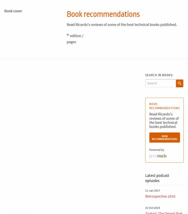 Nice work! Must be a good feeling to have such a big task completed and live. I'm always interested to hear how much time goes into larger jobs like this undertaken by a single developer: any idea how long you spent on it? I noticed a couple of minor display issues on the Books page. You can see both in the screenshot below: "Book recommendations" item seems to be missing expected content. Side column layout issue at some device widths. Edit: one more on this page... the "Powered by Goodreads" link is malformed. Again, a really great site.