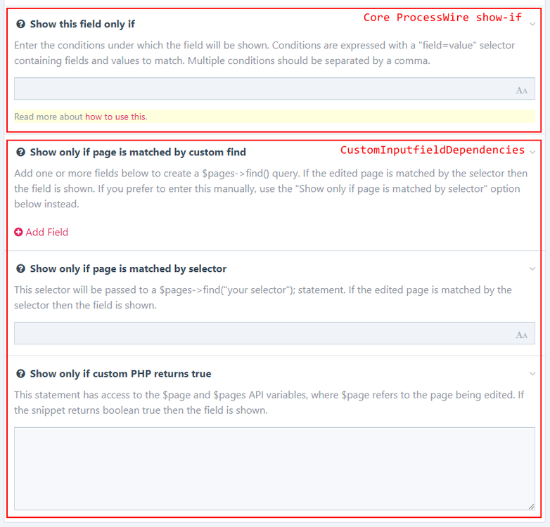 I don't know what the field structure is in your template. It should work fine as described in my previous post. Inputfield names doesn't have much to do with it - you use field names just as you would in any selector. If the selector matches your page in $pages->find($selector) then it should work in the "Show only if page is matched by selector" setting. Seeing screenshots of your template fields and the settings you have chosen for CustomInputfieldDependencies would help. That isn't related to this module. It comes from the core show-if and required-if features, so if you are seeing that in your markup it means you are not using the features added by CustomInputfieldDependencies. See the screenshot below.
