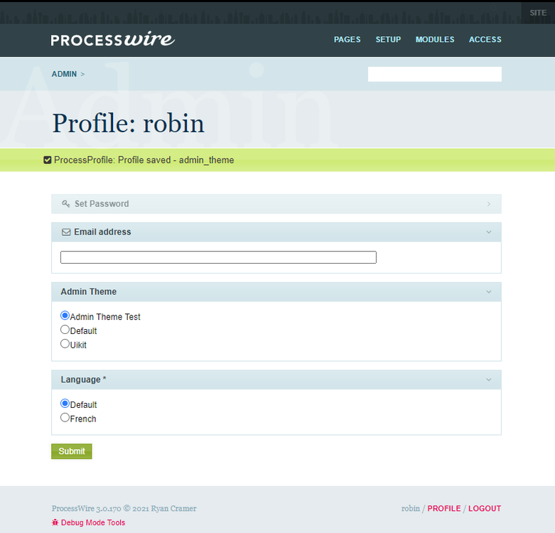 Below are the style overrides that I apply, mostly just spacing changes and fixes for things that looked off to me. There might be one or two things in there that don't make sense out of context because I'm also loading some custom JS to change the icon of the "user" menu and have the primary link be to the site frontend rather than the user profile. The problem is that if you create the minimal module that extends AdminThemeUikit (i.e. just the class declaration and the getModuleInfo method) then what you want to see is everything displaying as per AdminThemeUikit. Then you would add custom CSS/JS and override any AdminThemeUikit/AdminThemeFramework methods as needed. But what you actually see is this: If that is expected then it would be helpful to have some documentation or a blog post about how to go about extending AdminThemeUikit, or what file structure is needed for a full custom admin theme if anybody is game enough to try that. The only hookable methods that I can see are AdminThemeUikit:renderBreadcrumbs and AdminThemeFramework::getUserNavArray. So for the thing I mentioned (manipulating menus) you can only customise the "user" menu. It's not possible to dynamically add items to the Pages, Setup, Modules or Access menus without resorting to JS hacks like AdminOnSteroids does. And on the topic of the admin menus, the caching is a bit of a pain and doesn't measurably improve performance according to my tests: https://github.com/processwire/processwire-requests/issues/268#issuecomment-464200684 Another menu related request: https://github.com/processwire/processwire-requests/issues/189 What would be great is if for each major part of the admin theme layout (e.g. header, menus, top of content, bottom of content, footer) there was some hookable method so it was possible to inject custom markup at those points.