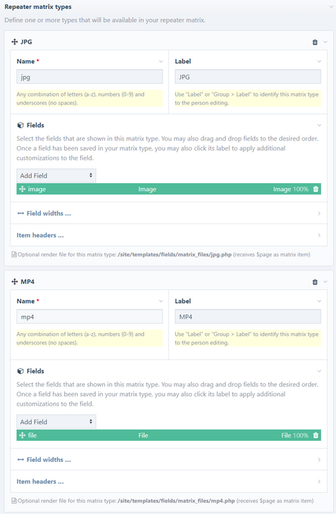 @joe_g, you could use a similar approach to that used by the Repeater Images module. Demo... Repeater Matrix field config: Hook in /site/ready.php: $wire->addHookBefore('Pages::saveReady', function(HookEvent $event) { /** @var Page $page */ $page = $event->arguments(0); if($page->template == 'demo_matrix_upload') { // File extension to Repeater Matrix type and subfield mapping $matrix_types = [ 'jpg' => [ 'type' => 'jpg', 'subfield' => 'image', ], 'mp4' => [ 'type' => 'mp4', 'subfield' => 'file', ], ]; // For each file in the "Upload files to Matrix" field foreach($page->upload_files_to_matrix as $pagefile) { // Skip file if it does not have an allowed file extension // It also makes sense to configure the upload field to only allow // the extensions you have matrix types for if(!isset($matrix_types[$pagefile->ext])) continue; // Add a Repeater Matrix item of the matching type for the file $item = $page->matrix_files->getNewItem(); $item->setMatrixType($matrix_types[$pagefile->ext]['type']); // Save the item so it is ready to accept files $item->save(); // Add the file $item->{$matrix_types[$pagefile->ext]['subfield']}->add($pagefile->filename); // Save the item again $item->save(); } // Remove all the uploaded files from the upload field $page->upload_files_to_matrix->removeAll(); } }); Result: