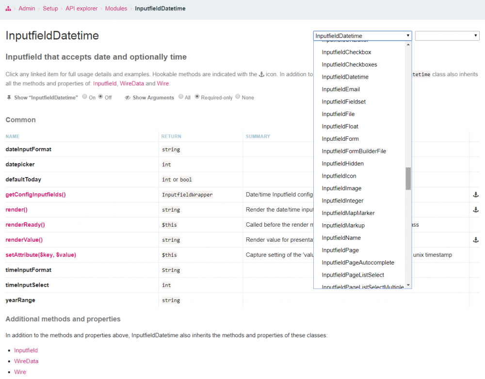 Besides Adrian's excellent suggestions... Many of the common inputfield properties are outlined here: https://processwire.com/api/ref/inputfield/ For properties specific to a particular inputfield type you can read the code comments in the core files, or if you have the very handy API Explorer pro module you can browse the properties in a nice interactive interface within the PW backend: -