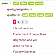 I am setting up a new processwire site (kathep.com/cms), and have a problem I can't find a solution to on the forum so far. I would like the footer of one of my templates (course.php), to display a random quote in a specific category, from a collection of quotes. I currently have the quotes stored in a text file, and have set up four fields in processwire to take the information (quote_text, quote_author, quote_category, quote_reference). My questions are: 1. What is the best way to store the quotes in processwire? I'm not sure if its best to create an individual page for each quote, or to shell out for protools and store them in a table. I saw this example from Sinnut on this thread which looks good to me: But as I'm a beginner, I'm seeking advice of someone with more expertise! Would this structure suit my use case? 2. What is the best way to allow quotes to be stored in multiple categories? Ideally I would like to be able to select multiple categories for some quotes. Would this best be done in with check boxes? I'm not sure. 3. In my course.php file, what is the best way to call a random quote from a specific category? Thank you for reading this, and I hope someone can help.