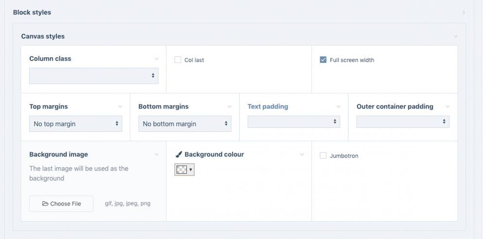 15. @MoritzLost Great tutorial I often use Repeater Matrix field with an added Fieldset Page containing the styling options for that section. FS page means it's easy to add a single field to different templates. Like you, I only give the client what options they need rather than the complete set. In the example below, the HTML theme is Canvas which is based on Bootstrap.