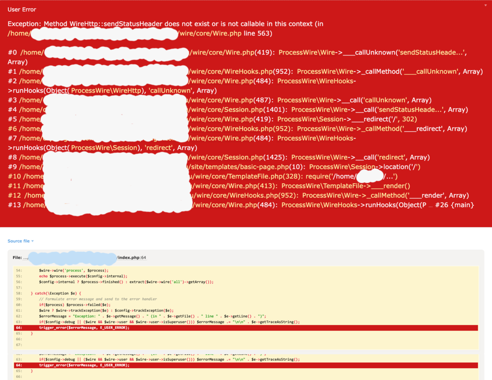 I've been working on a a new site for weeks. $session did it's normal, wonderful stuff until today when it didn't - boom!!! $session now occasionally holds vars from one page to another. The killer is $session->location or $session->redirect. Before redirecting, the page crashes with: I went back to basics with the default theme: Using ProcessWire 3.0.212 dev PHP v8.1 (tried 7.4 & 8.0 too) Error occurs in Chrome & Firefox Editing modules, eg turning TracyDebugger on/off also triggers the problem Error occurs in front and back end. Often, clicking on a link to a different page clears the error but $session still screwy. Have no idea why PW suddenly stopped correctly wiring $session. Is this a bug? Am I doing something wrong? Help & ideas on how to fix gratefully accepted. Solved: Upload a fresh copy of WireHTTP to my server. Previous version may have been corrupted in transit.