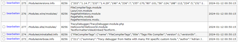 Did you find a solution? In my case, the same "glitch" happened when trying to update PW to 3.0.226 / 3.0.227. I could imagine that in my case it has something to do with the refactoring of the Modules class, but I am just guessing. After several hours of testing I switched back to PW 3.0.210 and deleted the following entries from the database table modules, to get rid of the error messages: If anyone has any clues about this issue, please let me know.