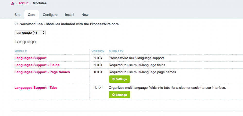 Running the latest PW install. Installed all 4 Language modules and the language pack for Spanish. I can change my default language and see all the labels in the admin change to spanish. But when I go to ANY page in the tree, I see only a single URL field (default). I do not see the additional field to enter the "/es/" into. From the docs (what I don't see): Any suggestions on where to look?