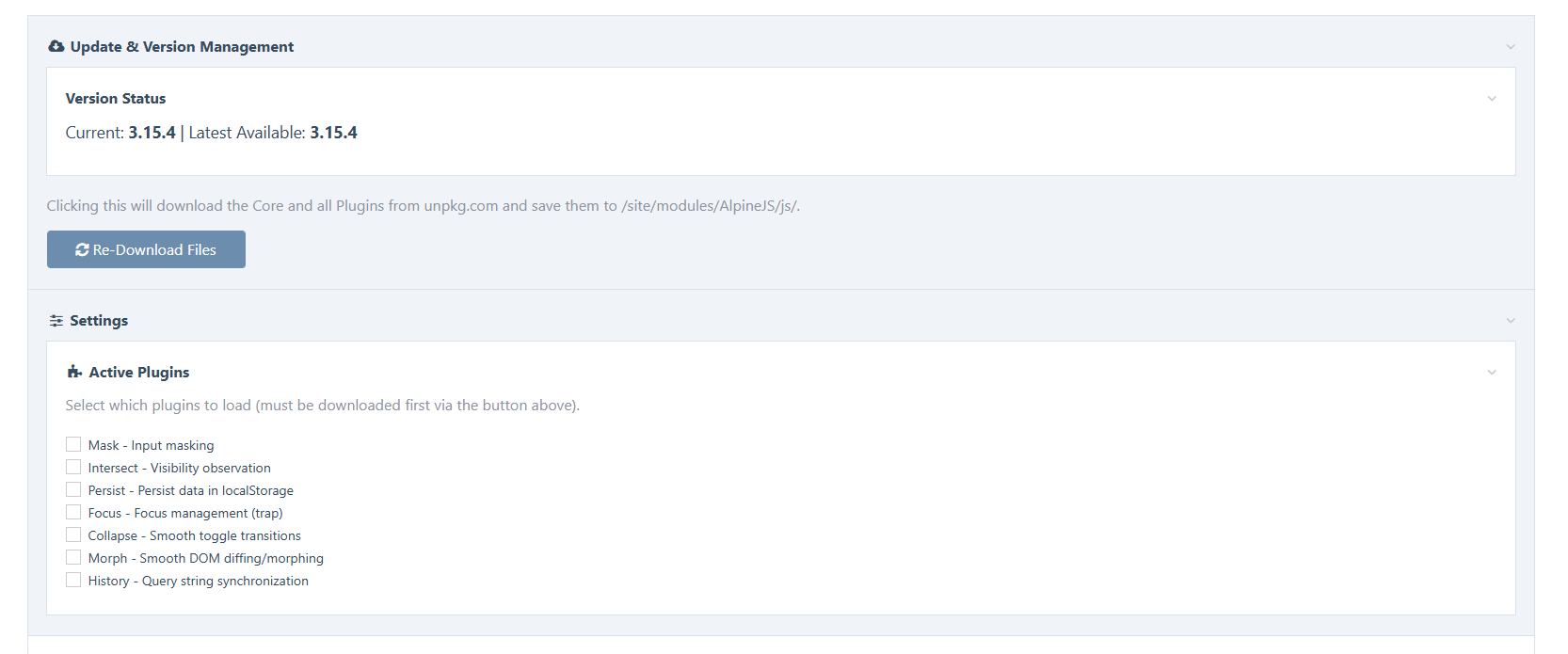 Hi @elabx, First of all, thank you for the AlpineJS module! I have been working on a fork to modernize the module and make it more flexible for my projects. Instead of shipping a static (and potentially outdated) JS file, I implemented a downloader mechanism. Here is a summary of the new features I added: Local Hosting & Updater: The module can now download the latest Alpine.js core and plugins directly from unpkg.com to the server. This allows for 1-Click Updates via the module config without needing a module update. Plugin Support: Added checkboxes to easily enable official plugins (Mask, Intersect, Persist, Focus, Collapse, Morph, History). You can review the changes in my fork here: https://github.com/markusthomas/AlpineJS I think these changes would be a good addition to the your repository. Would you be interested in a Pull Request? Best regards, Markus