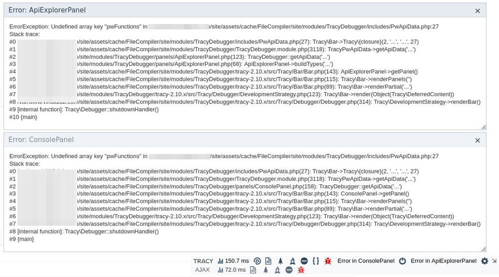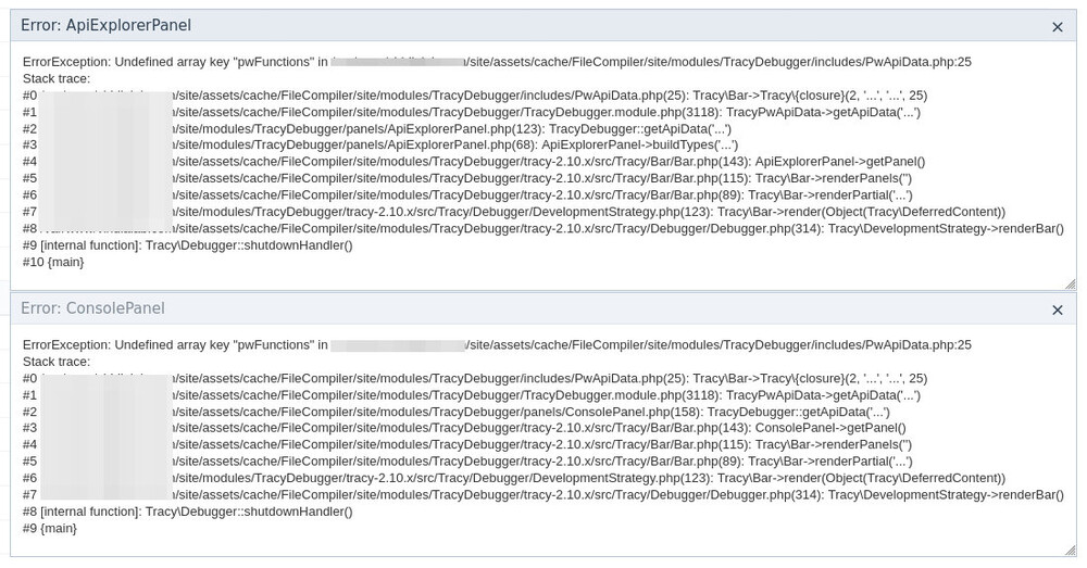 Howdy Adrian, I just upgraded to v4.26.67 in an attempt to fix a console error in the previous version. However this new error is different from the last. I read through the earlier post by nurkka, November 19, 2024 but your suggestions there did not resolve my issue. My original error suddenly appeared this morning after logging into the admin. "Error in ConsolePanel" is displayed in the debug bar. Everything was fine last evening before I logged out. This morning after logging in I noticed the error. I followed your suggestions from the post above without affect. After upgrading Tracy to this new version I now get the following error: Undefined array key "pwFunctions" in .../site/assets/cache/FileCompiler/site/modules/TracyDebugger/includes/PwApiData.php:25 This error is different from my original error which referenced a different file -- Sorry I don't have that exact filename as I deleted the cache as one of my troubleshooting steps. I believe it was the cached phpconsole file. Please let me know what additional information you need from me. Thanks! Rick