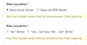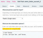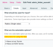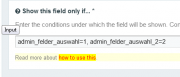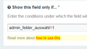 In the Admin I use a "fieldtype options radio button (single value)" to display different fields depending on which radio button is clicked. My issue in short is, that I get it working with one radio button. But not if I use two which are nested. Let me explain: This is the fieldtype setup for the radio button: If I want a field to only display if the 1. radio button is clicked I specify his "show if - behavior" like this: This works like a charme. No question. But if I add a second radio button (pair) with the following setup: ... which only shows if the 1. of the first radio button (pair) is clicked, like this: I get in trouble ... Btw this second radio button (pair) should allow me again to display different fields dependent on which radio button is clicked. Lets say I want to display a field only if the 2. of the second radio button pair is clicked - and therefore the 1. of the first radio button pair has to be clicked before, I thought I had to do this: But this doesn't work! The field is always displayed, also if I click the 1. of the second radio button pair. So how can I assign these multiple conditions correctly? Thank you for any hint on this