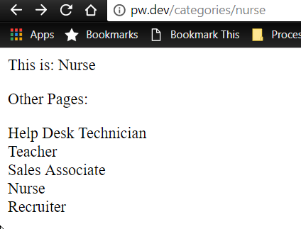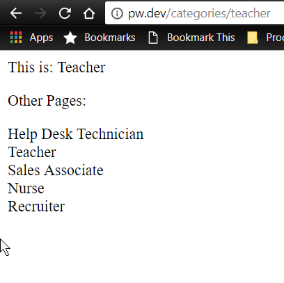 I'm not getting that behavior. I tired to replicate your setup. This is what I have ended up with (I use jobs instead of categories but it shouldnt matter) <?php namespace ProcessWire; // categories.routes.php if (input()->urlSegment2) throw new Wire404Exception(); if (input()->urlSegment1) { /** @var Pages $pages */ $name = sanitizer()->pageName(input()->urlSegment1); $match = $pages->findOne("template=profession, name=$name"); if (!$match->id) throw new Wire404Exception(); echo $match->render(); return $this->halt(); } This is my _init.php. It gets included to every template (after its routes, if exists) <?php namespace ProcessWire; require_once '_func.php'; $testPages = $pages->find('template=profession, limit=5'); And I use it inside actual page template that renders `category` page <?php namespace ProcessWire; ?> This is: <?= $page->title ?> <p>Other Pages:</p> <?php foreach ($testPages as $p): ?> <?= $p->title ?><br> <?php endforeach; ?> And both pages render correctly So, to me the only thing that seems missing is echo statement before $p->render() and return $this->halt(); after that EDIT: This is the backend structure, I am guessing you have a similar one. You get categories from another parent