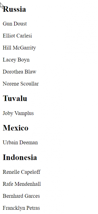 You can group pages depending on a field and output them like this. I used `country` field, instead of `zipcode` but it doesnt change anything <?php namespace ProcessWire; $persons = $pages->find('template=person'); $grouped = []; foreach ($persons as $person) { $country = $person->country; if (isset($grouped[$country])) { $grouped[$country][] = $person; } else { $grouped[$country] = [$person]; } } ?> <?php foreach ($grouped as $country => $people): ?> <h2><?= $country ?></h2> <?php foreach ($people as $p): ?> <p><?= $p->title ?></p> <?php endforeach; ?> <?php endforeach; ?> Which outputs something like this