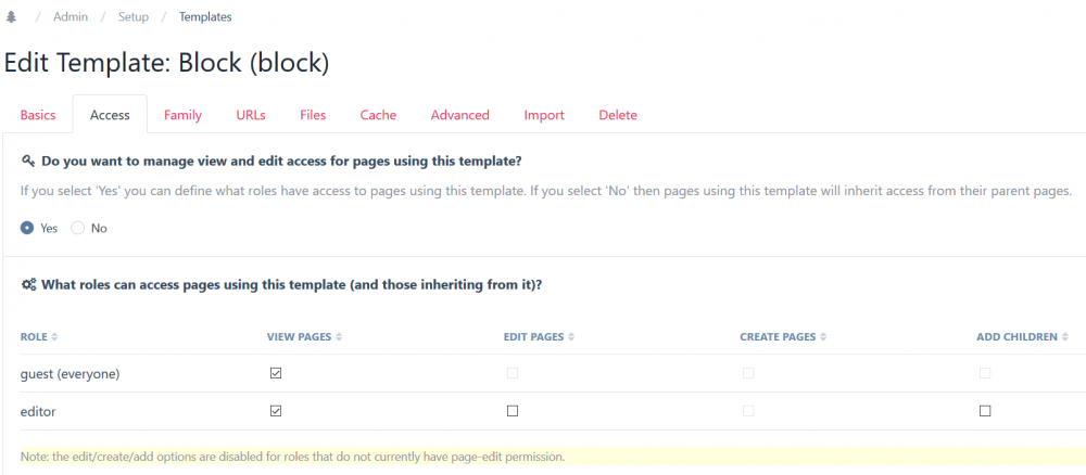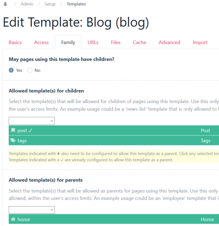 Ok, I've checked out the source. It could also be a permission issue. Check if you changed access settings for a role. // ProcessPageAdd.module /** * Returns an array of templates that are allowed to be used here * */ protected function ___getAllowedTemplates($parent = null) { // ... $templates = []; // ... foreach ($allTemplates as $t) { if ($t->noParents == -1) { // only 1 of this type allowed if ($t->getNumPages() > 0) continue; } elseif ($t->noParents) { continue; } if ($t->useRoles && !$user->hasPermission('page-create', $t)) continue; if (!$t->useRoles && !$parentEditable) continue; if (!$t->useRoles && !$user->hasPermission('page-create', $parent)) continue; if (count($allParents) == 1) { if (count($parent->template->childTemplates)) { // check that this template is allowed by the defined parent if (!in_array($t->id, $parent->template->childTemplates)) continue; } } if (count($t->parentTemplates)) { // this template is only allowed for certain parents // ... } // ... $templates[$t->id] = $t; } // ... $this->allowedTemplates = $templates; return $templates; } -