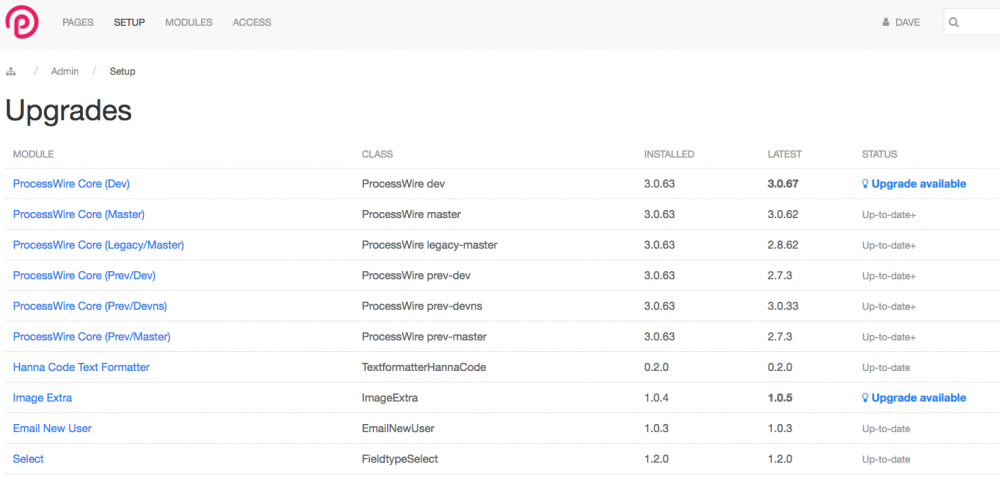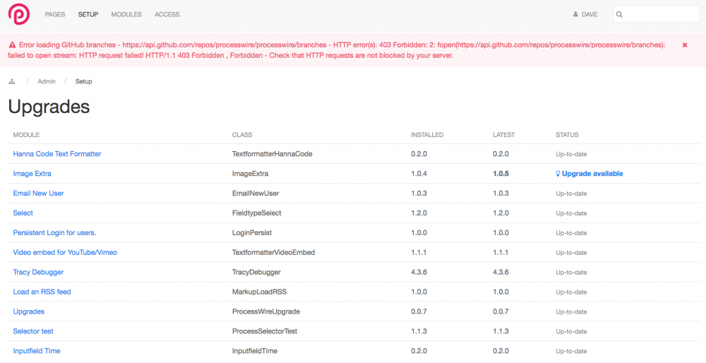 Done some more digging on this. Tried adding ini_set("user_agent", "PHP " . PHP_VERSION); to config.php. Didn't work. Found https://github.com/BitPoet/ProcessWireUpgrade/blob/dev-useragentfix/ProcessWireUpgrade.module and added $ua = ini_get("user_agent"); if(empty($ua)) ini_set("user_agent", "PHP " . PHP_VERSION); (Lines 101 & 102) to ProcessWireUpgrade.module, per @BitPoet's fork. Didn't work. I also added, as a test, <?php ini_set('user_agent', 'ABC'); echo ini_get('user_agent'); ?> to one of my template files and it did echo 'ABC', so ini_set() is working. So it isn't user_agent that is causing the problem.