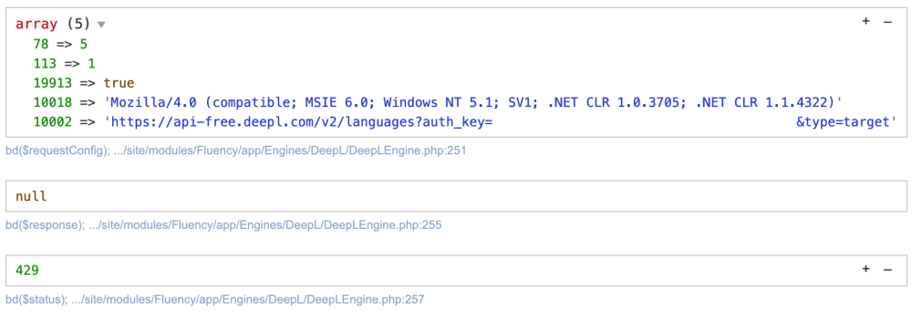 @FireWire No, never used Fluency or the DeepL API before. The account has been created today, the key is fresh and I could successfully use it with curl from the shell without problems. I do not really understand the goal of the requests that are made on the settings page. As I get status 200 for 3 times, the connection to the API looks fine to me. This looks like requests 2 and 4 are identical (same endpoint, data and method). As they are made immediately after another a rate limit error is to be expected. What is the outcome or behaviour you would expect?- 301 replies