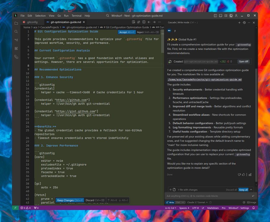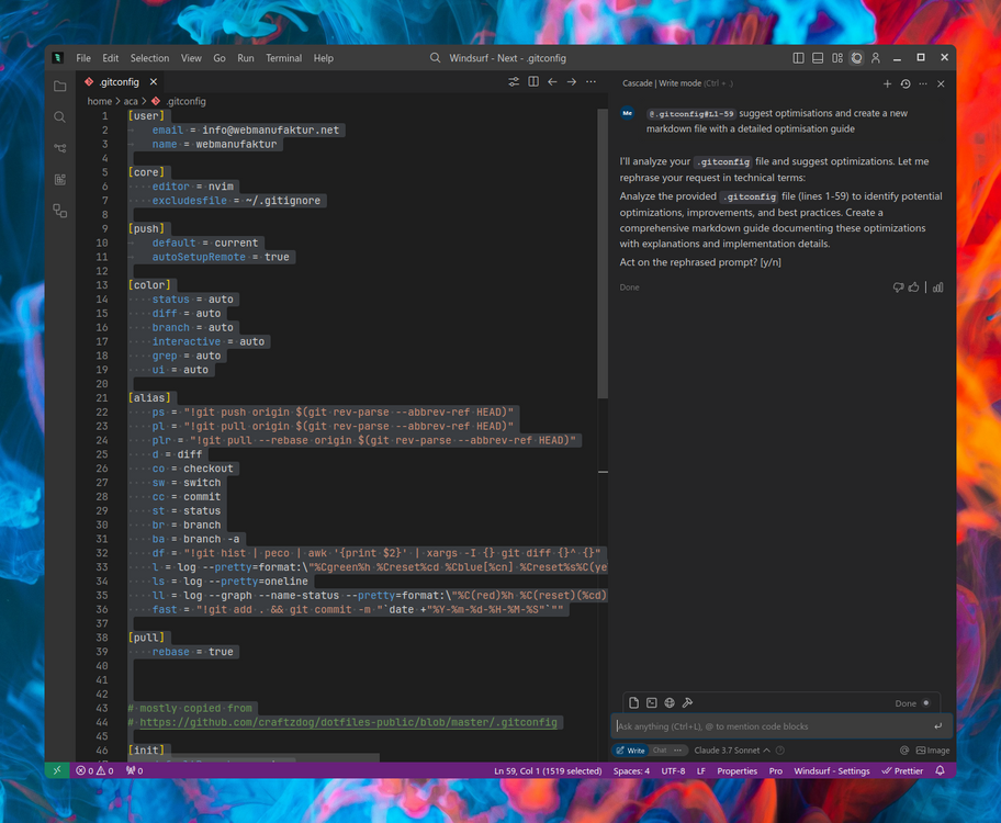 Based on the given Rephrasing prompt from @gebeer I played around and created this file/rule to import either globally or put it inside my rules file - could be a self-contained .mdc file as well in the future: <!-- Global Rule: 1 --> --- name: Global Rule #1 description: The very first global rule to apply the moment the user starts a task globs: **/*.* alwaysApply: true --- # Before starting a task 1. analyze the given prompt and understand the intention 2. rephrase the user prompt in concise technical terms focusing on: - specific technical task scope - affected components/files - required functionality changes 3. preserve the users intent in the rephrased prompt 4. output the rephrased prompt and ask for confirmation with exact phrase "Act on the rephrased prompt? [y/n]" 5. IMPORTANT: after asking for confirmation, STOP and wait for explicit user response 6. proceed ONLY after receiving "y" confirmation, otherwise ask for clarification 7. when proceeding, act only on the rephrased prompt and start your output with "✨✨✨" and {name} of rule <!-- /Global Rule: 1 --> It's pretty much the same prompt but in a different structure with additional metadata. Cursor and Windsurf seem to love those little nuggets of metadata. The frontmatter - indicated by leading/trailing triple dashes - allows to add metadata. In this case you could output the rule name later on when needed like in #7., or give additional context whenever this rule should be applied. So far it works pretty much as expected in my testcases - which where in bash scripting (.sh), Laravel (.blade.php), PHP, PW-specific, AstroJS (.astro, .tsx), NextJS (.tsx). In total about 100 credits in Windsurf through various projects I had to do stuff in. Example 1: Built this maintenance script - based of 3-5 other scripts, with about 15 prompts to make it work on Ubuntu, Debian, Arch. I'm pretty happy so far as the script also adds whatever I need - like NPM, PNPM, Flatpaks if not installed. Could become a whole project on its own. Super stoked! Example 2: Asked for optimising my .gitconfig file and put suggestions into a new file. The result... looks good, not sure about each and every detail based on personal preferences but... YEAH!