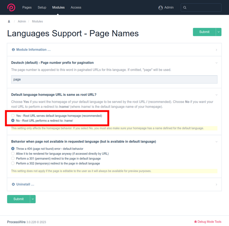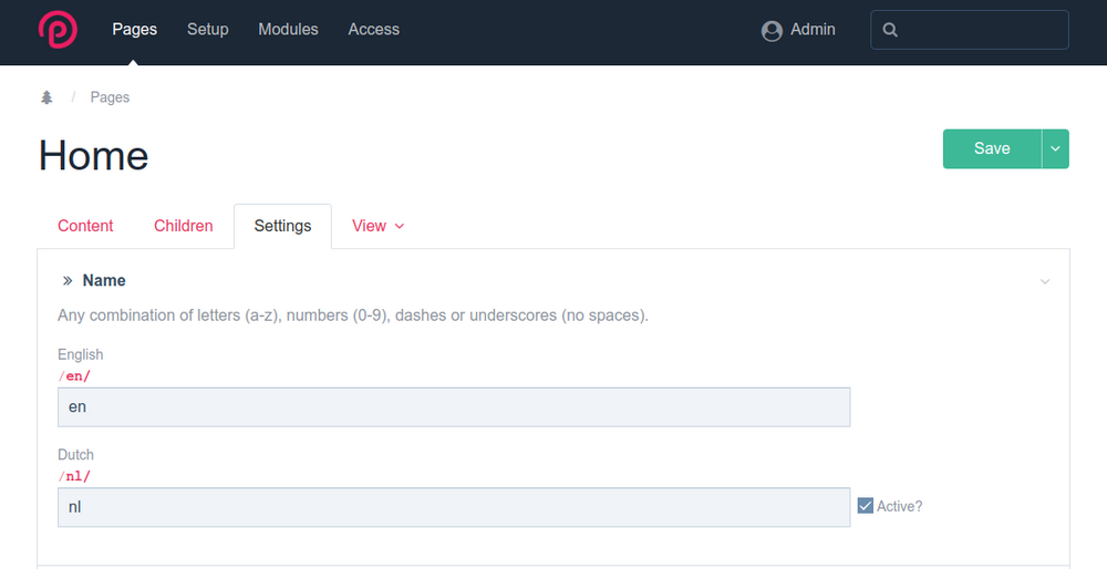 First: define the matching /name/ for each language in your homepage Second: Go to Modules > Core > Languages Support - Page Names > Settings and define the behaviour This way the homepage will redirect to your specified default language /name/ if set. It won't redirect from /nl/ or /es/ back to the default one. In case you want to switch to another language as the default one - take a look here: Change homepage's default language
