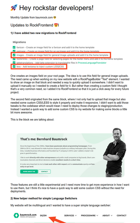 Content-wise... a great update, as I am not that often around here right now. The moment my latest projects are done, or at least in review, or... short before release I will drop you a message as RockPageBuilder sounds interesting. But right before that I have to try RockMigrations and RepeaterMatrix support - as those are spread around so many projects of mine. ? Besides that... there is one thing you could look into right now: Screenshot: Thunderbird 115.3.1 (Linux) Readability. It's quite hard to read due to those tight line-heights, and maybe the foreground/background contrast could be smoother. Yet, line-height is an real issue for me here. I wanted to read it, so I did. Otherwise I'd probably just ignored the mail (if it wasn't from you). Oh... and you better send a newsletter the moment your new website is ready!