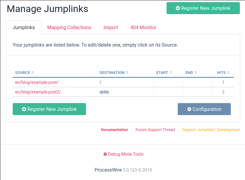 1. Ok. I don't know if there is anything modified in your site or a difference in our installed modules so this might not work but I just installed ProcessBlog & MarkupBlog and of course the latest Jumplinks module. I unpublished the example post, opened it in a private window where a 404 showed up. I looked into the Jumplinks 404 monitor and found the request. I opened that entry, created a new jumplink from it and visited the URL in a private window again and... it worked. ProcessWire 3.0.123 the other modules straight from modules.processwire.com.