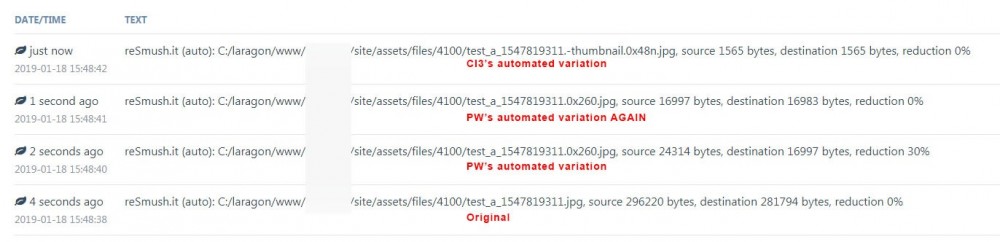 No. On the screenshot are the logs I'm getting when upload an image. It seems that it's missing the CI3's automated variation from the "Crop Settings" but instead it optimize PW's automated variation twice.