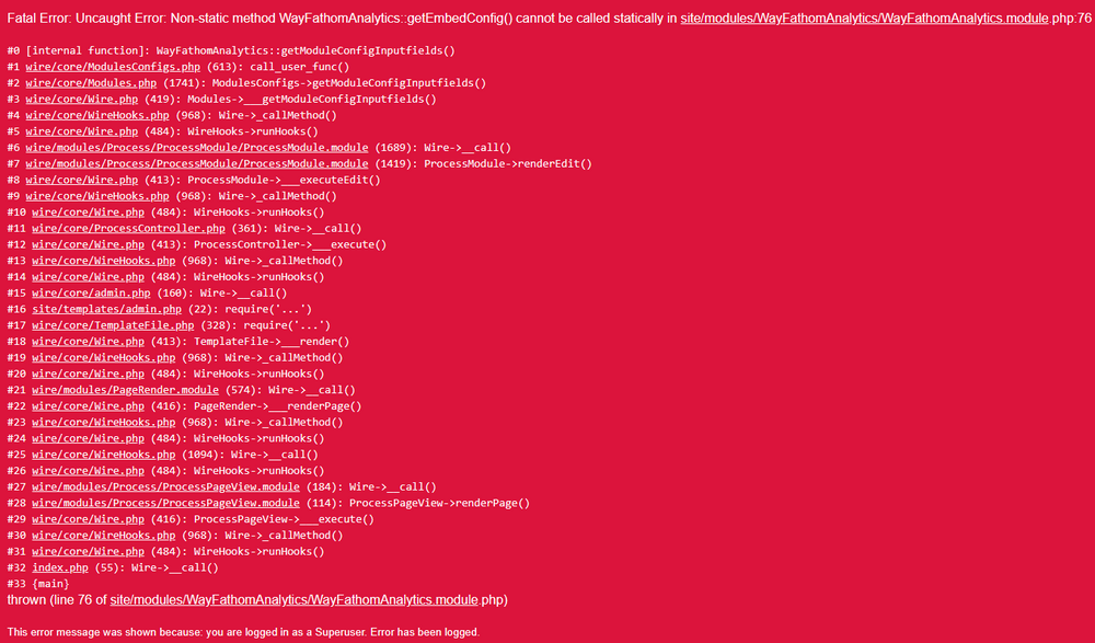 Hi @Craig On PHP 8.1 and 8.2 the module throws a fatal error (at least with 3 different hosters) after install: In short: Fatal Error: Uncaught Error: Non-static method WayFathomAnalytics::getEmbedConfig() cannot be called statically in /site/modules/WayFathomAnalytics/WayFathomAnalytics.module.php:76 EDIT: removing static from the function seems to work (line 61 in WayFathomAnalytics.module.php) But I don't know enough about PHP functions ... -