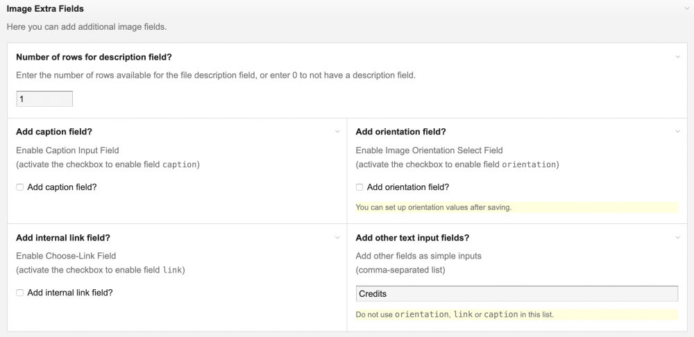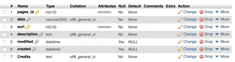 Hi. For some reason, without doing any changes on my part to the PW install over the last 2 years, the image extra field that I had set up disappeard just now from the edit page: I have setup the image field with a custom text input as follows: But I do not see this with the image when editing a page: In the database, the field is available and filled for all "old" pages that were created a while back: [Note: I have just now, after the issue occured, manually changed the default in the table from None to "" as it otherwise would not have allowed me to upload any new images] Did anyone encounter this before? How do I get the field back to show when editing pages? Any help would be highly appreciated! Best Lars
