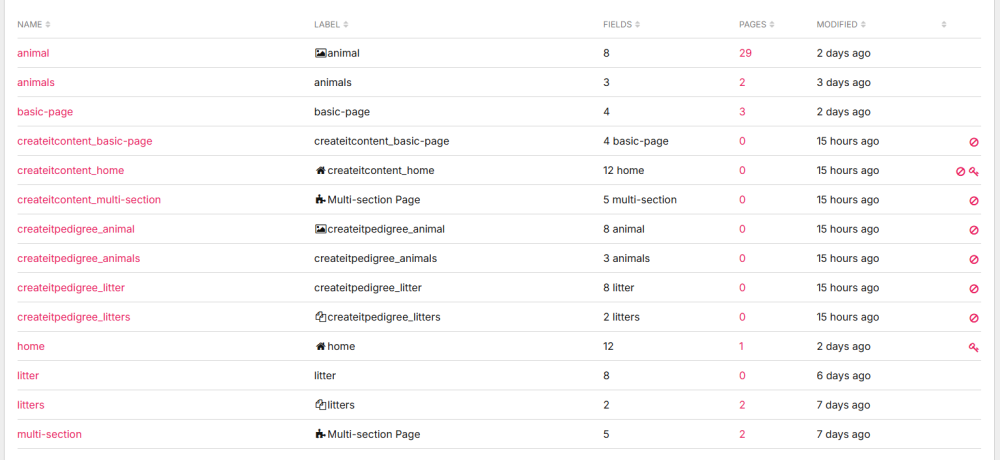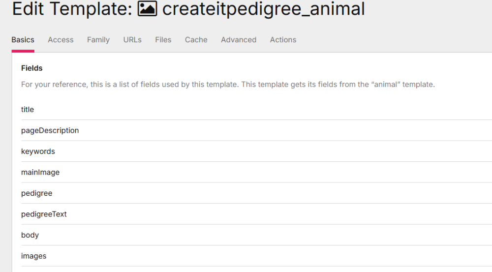 I love the concept of config migrations with each field and template having its own file, as it's much more in line with what I'm used to with ASP.Net Core and Visual Studio where you can build some things visually, but still end up with code, and it's also tidier with version control, as fields or templates that don't change are kept separate. Another benefit I see of using config migrations, is that due to module dependencies, unlike site profiles that are all or nothing, it's possible to define a basic set of fields for a site in a module, even if the module doesn't do much other than install fields and templates, and then you have a working site with some base functionality. If you want additional functionality on some sites but not others, but require certain fields or templates to exist before you add the additional functionality, the module dependency can take care of this. eg, I might start off wanting just a basic site, then want to add a blog, but a blog template will use some of the same fields as the basic site, but I don't want to have to redefine them, just be sure they already exist before I install the blog upgrade. The issue I've struck is an existing project that I've defined fields and templates with using the ProcessWire UI, but now I want to bundle some of them up into a module. The scenario is I've started building what I think is a one-off site, then I realise that different components have the potential to be reused on multiple sites, but exporting a site profile is too inflexible. Here's a screenshot of templates after copying and pasting template data from existing templates into config migrations for two new modules and installing them. As you can see there are duplicate templates, the originals with no prefix, and new ones prefixed with the module name. I want to avoid this, but still like using the ProcessWire UI to design fields and templates, because I'm forgetful and can't remember all the properties and what they do, and I find the UI reminds me, but once I've created or updated a field or template, I want to add it to a migration file so that it's easy to update across multiple sites. Would renaming the templates (same thing applies to fields) to the naming convention of config migrations avoid this doubling up? Also, if I edit one of these apparent duplicate fields, I get this: If I edit the actual "animal" template I get all the usual field editing options, with the normal warning that RockMigrations is installed, although in my config file I've got: $config->noMigrate = true; to prevent rockMigrations overriding changes I make via the ProcessWire UI on my development site, although installing the modules still appears to have triggered the config migrations. Ideally I'd like to avoid what looks like two definitions of the same thing, and still have the UI based editing available. What's the best way to achieve this?