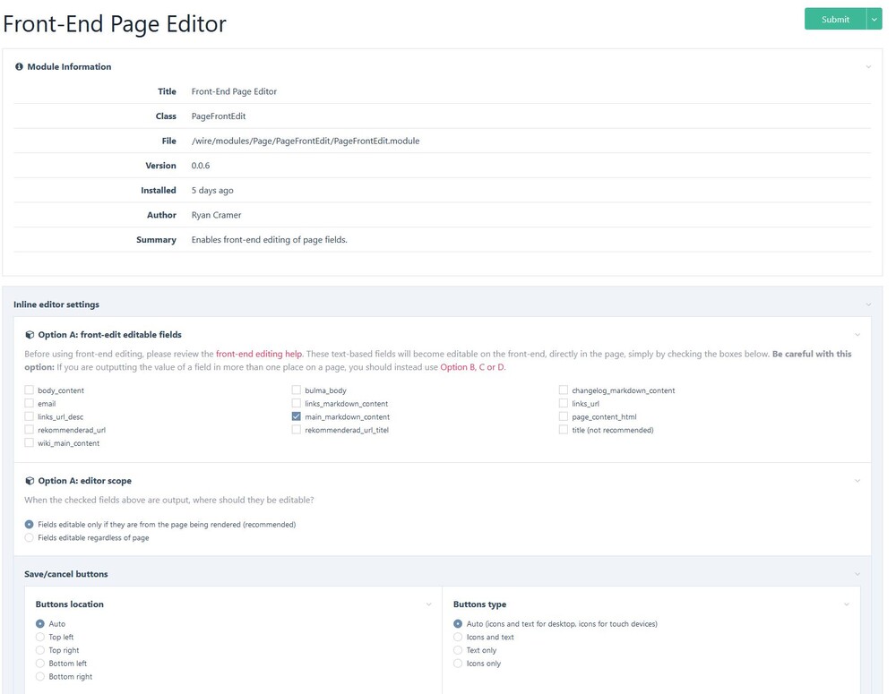Hello There fellow PW users. I am writing to get your advice on how to figure this problem out. I have never used the Front-end Editing functions of PW before so i tought i try it out. Using Ryans Front-end Page Editor module version 0.0.6. And i am using option A (automatic editing) method described in the documentation together with: <?PHP /* In my setup 'main_markdown_content' is a textarea field with a 'Markdown/Parsedown' textformatter. and inputfieldtype 'Textarea' selected on details tab for the field. Also content type is 'Unknown/Text' is selected. I get a warning when editing this field: -"This field currently allows Markup/HTML in formatted output. If you do not intend to allow Markup/HTML, please select the “HTML Entity Encoder” for “Text formatters”. But the field is storing Markdown and not HTML, as i understand it, the markdown gets rendered into HTML by the textformatter at runtime when outputting the field in my template ? */ /* using Option A (automatic editing) */ echo($page->main_markdown_content); ?> So far so good, it works, the trouble comes when the field is saved when clicking "Save" button on the frontend. For some reason new line endings are added to every line in my Markdown. Lets say this is the markdown (sorry for the swedish): # Sommar 2024 Sommar och sol, värme och regn om vart annat, för att inte tala om pollen. /EyeDentify. ## Uppdateringar - **2024-07-13:** Har uppdaterat Bulma.JS och önskar glad sommar. - **2024-04-10:** Önskar en trevlig vår. - **2023-12-24:** Önskar God Jul och Gott nytt år. - **2023-01-11:** Det är ett nytt år och jag fortsätter jobba på siten. Har planer för att utveckla den. Mer om det senare. And that after saving the frontend field ends up looking like this when i check it in the Admin editor: # Sommar 2024 Sommar och sol, värme och regn om vart annat, för att inte tala om pollen. /EyeDentify ## Uppdateringar - **2024-07-13:** Har uppdaterat Bulma.JS och önskar glad sommar. - **2024-04-10:** Önskar en trevlig vår. - **2023-12-24:** Önskar God Jul och Gott nytt år. - **2023-01-11:** Det är ett nytt år och jag fortsätter jobba på siten. Har planer för att utveckla den. Mer om det senare. (data above is copied exactly from the field after a save and it adds extra spaces.) Which is not what i want, the textformatter outputs the HTML as expected but it has more line endings and spaces between rows. I have to edit out the extra spaces in the Admin backend editor to make it go back to my original Markdown. I can´t figure out what is happening so i turned the editing of for now. Would realy like to be able to use it. You PW gurus have any ideas to what is going on ? If you want any other info to help me, just say so and i will try to supply it. Thanks again! /EyeDentify