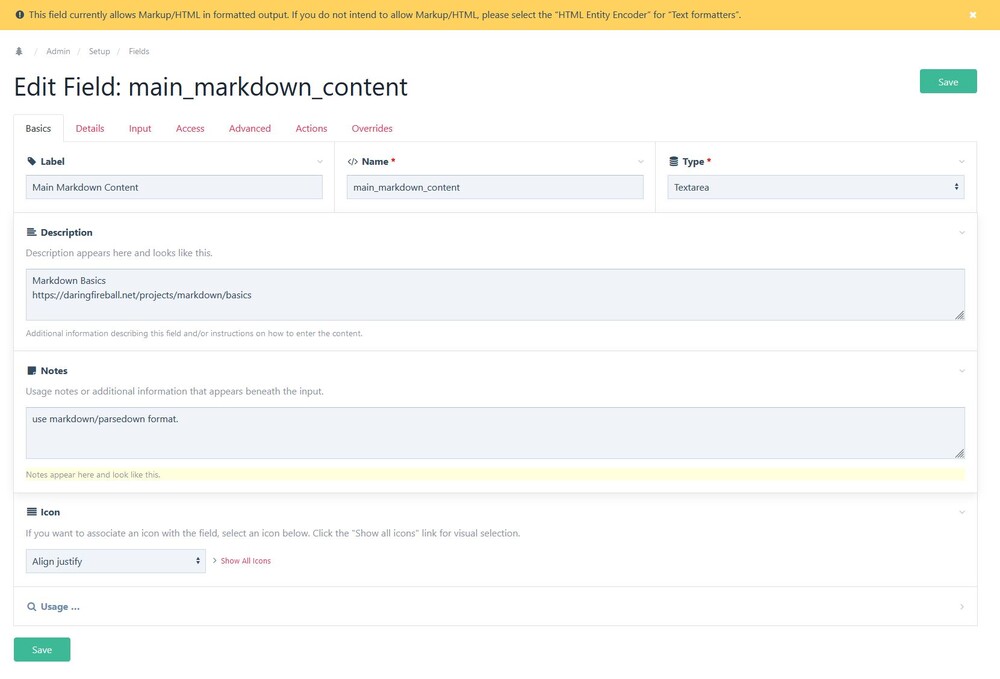I thought i supply some screenshots of my settings on the "main_markdown_content" field that is using the "Markdown/Parsedown" textformatter. Included a screenshot on the Front-End Page Editor settings as well for comparing. First the fields Basics tab Then the Details tab Then the Markdown/Parsedown modules settings: And finaly the Front-End Page Editor settings: I find that if i involve the "HTML Entity Encoder" textformater trouble ensues. So i only use hte Markdown/Parsedown formatter alone. That seems to work the best and lets me mix Markdown and HTML in the same textarea. I don´t use any of the advanced editors for the Textarea. Thats just how i roll. Hope this will give some more information to solve this mystery.