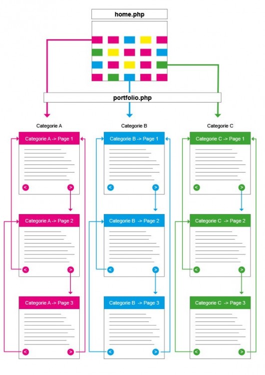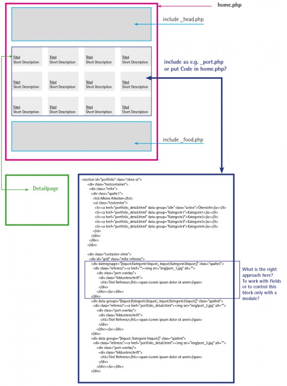 Hi, first of all, I wish the whole community a good start into the new year. After some time, I have some time again to take care of my implementation problem. I try to achieve that: That is the html-code: <!-- Portfolio Thumbs--> <section id="portfolio" class="no-pad-btm"> <div class="container text-center"> <div class="row"> <div class="col-sm-10 col-sm-offset-1"> <h3>Aktuelle Arbeiten</h3> <ul class="portfolio-sorting list-inline text-center"> <li><a href="#" data-group="all" class="active">Übersicht</a></li> <li><a href="#" data-group="design">Design</a></li> <li><a href="#" data-group="web/ux">Web/UX</a></li> <li><a href="#" data-group="kataloge">Kataloge</a></li> <li><a href="#" data-group="editorial">Editorial</a></li> </ul> </div> </div> </div> <div class="container-fluid"> <div id="grid" class="row portfolio-items"> <div data-groups="["design", "web/ux"]" class="col-md-3 col-sm-6 no-pad"> <div class="portfolio-item"><a href="#"><img src="site/templates/port_1.jpg" alt=""> <div class="portfolio-overlay"> <div class="caption"> <h5>Titel 1</h5><span>Here my small description</span> </div> </div></a></div> </div> <div data-groups="["kataloge", "design"]" class="col-md-3 col-sm-6 no-pad"> <div class="portfolio-item"><a href="#"><img src="site/templates/port_2.jpg" alt=""> <div class="portfolio-overlay"> <div class="caption"> <h5>Titel</h5><span>description</span> </div> </div></a></div> </div> <!-- Thumbs End --> </div> </div> </section> In Processwire I have adapted the code, unfortunately, the images and the rest are displayed one below the other and not separated: That is the adapted code: <!-- Portfolio Thumbs--> <section id="portfolio" class="no-pad-btm"> <div class="container text-center"> <div class="row"> <div class="col-sm-10 col-sm-offset-1"> <h3>Aktuelle Arbeiten</h3> <ul class="portfolio-sorting list-inline text-center"> <li><a href="#" data-group="all" class="active">Übersicht</a></li> <li><a href="#" data-group="design">Design</a></li> <li><a href="#" data-group="web/ux">Web/UX</a></li> <li><a href="#" data-group="kataloge">Kataloge</a></li> <li><a href="#" data-group="editorial">Editorial</a></li> </ul> </div> </div> </div> <div class="container-fluid"> <div id="grid" class="row portfolio-items"> <div data-groups="<?php foreach($page->portfoliothumbs as $port) { echo "{$port->lb_home_port_datagroup}"; } ?>" class="col-md-3 col-sm-6 no-pad"> <div class="portfolio-item"> <?php foreach($page->portfoliothumbs as $port) { echo "<a href={$port->lb_home_port_img_thumb_url->url}><img src={$port->lb_home_port_img_thumb->url} alt={$port->lb_home_port_img_thumb->description} >"; } ?> <div class="portfolio-overlay"> <div class="caption"> <h5> <?php foreach($page->portfoliothumbs as $port) { echo "{$port->lb_home_port_titel}"; } ?> </h5> <span> <?php foreach($page->portfoliothumbs as $port) { echo "{$port->lb_home_port_description}"; } ?> </span> </div> </div></a> </div> </div> <!-- Thumbs End --> </div> </div> </section> Processwire fields: I suspect the "foreach loop" needs to start at the top. I tried that but get constantly error messages in the syntax ... Can someone of the PHP professionals give me a tip how the code has to look, so that the div blocks place next to each other Thx in regard
