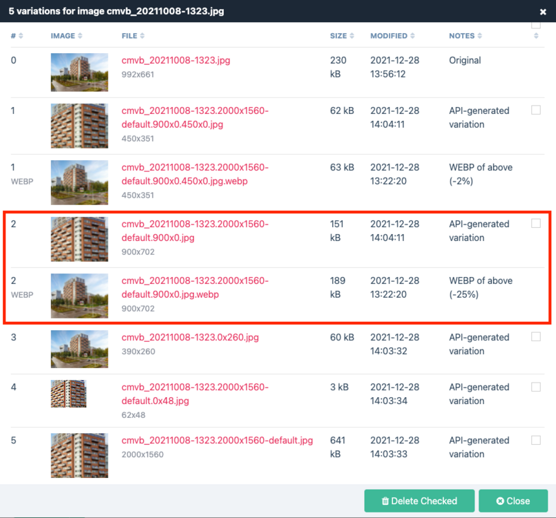 Hi @horst, thanks for your code example, but unfortunately it still doesn't work as expected. See the attached screenshots below, both of the overview of generated variations in the backend. I made an 'extreme' cropping to show the difference with the original image. 1) The image variations before loading the template with your example code in frontend. I marked the cropped variation with a red border: 2) The image variations after loading the template with your example code in frontend. I marked the frontend-generated 900 pixel width variants with a red border. The JPG version is OK, but the WEBP version is not ? Groeten terug uit Maastricht! ??