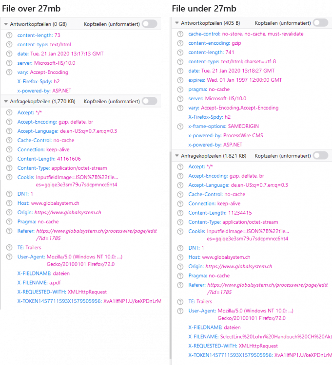 [SOLVED] Console Error when uploading larger filesMarcel Stäheli replied to Marcel Stäheli's topic in General Support Thank you for your reply. I looked through these posts, but nothing helped so far. There are no errors in the PW-Logs. I run PHP 7.2.7 so there is no "always_populate_raw_post_data" Option to look for. It seems like an error on the client side. It happens in every browser. I had a look at the network tab, and it seems the request itself is corrupt already, it has a length of 73 compared to 741 with a successful upload (see screenshot). The response with the error upload is: The page was not displayed, because the request unit is too big. (Die Seite wurde nicht angezeigt, da die Anforderungseinheit zu groß ist.)