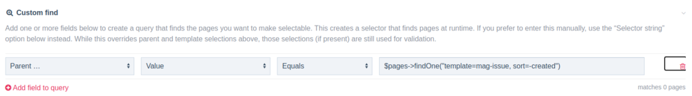 The site is structured this way: mag-issue1 - article1 - article2 - article3 ... mag-issue2 - article1 - article2 - article3 ... mag-issue3 - article1 - article2 - article3 ... ... The idea is to select the children of the latest mag-issue as the selectable pages for the page reference field. -