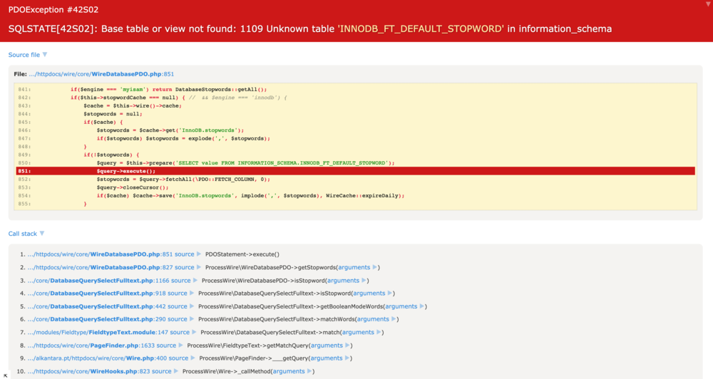 Hi, I am having an issue while migrating a site from the development server to the live server. On the dev server we have the mysql 5.6 and on the client live server we have the mysql 5.5. During the migration to the live server during the process of importing the exported SQL file we start to receive the following error: SQL query: ALTER TABLE `fieldtype_options` ADD FULLTEXT KEY `title_value` (`title`,`value`) MySQL said: Documentation #1214 - The used table type doesn't support FULLTEXT indexes After some research the solution was to run the following command on each table ALTER TABLE <table name> ENGINE = MYISAM So at the end of the SQL file we enter this command for each table and the SQL file was imported correctly without any error. It seams that everything was alright but while testing the search functionality on the frontend we are getting the following error: SQLSTATE[42S02]: Base table or view not found: 1109 Unknown table 'INNODB_FT_DEFAULT_STOPWORD' in information_schema (Full error on the attached image) Executing the query: SELECT * FROM INFORMATION_SCHEMA.TABLES the table "INNODB_FT_DEFAULT_STOPWORD" is not there. While questioning the server support I am not getting any answer how to fix this and i can't find any solution to fix this while using the mysql 5.5 or if it is a mysql 5.5 installation issue and the table should be there. As far as I can understand the table "INNODB_FT_DEFAULT_STOPWORD" is a internal mysql table and should exist on the "INFORMATION_SCHEMA", but I can be wrong about this. I could not find much information about this table on a mysql 5.5 server. Any ideia or solution (if any) I would be most appreciated. Thank you