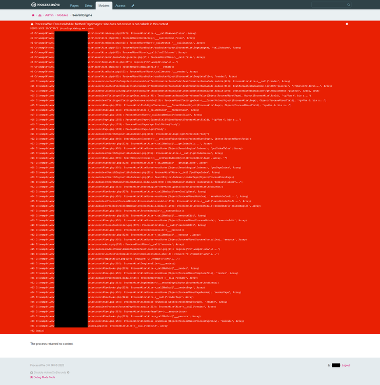 @teppo Thanks for your help! Sorry for the delay (and sorry I have to get back to this). Yes, you're right, I use Hanna Code on my site. My code works fine though except when called by your indexer. I noticed another thing: When trying to save the page which calls my HC, PW gives the same error as above. This is the content of my HC causing the trouble: if($page->images_gallery->count()) { // images_gallery is a repeater field $gallery = "<div class='gallery'>"; foreach($page->images_gallery as $img) { if($img->image_caption) { $titleAttr = "title='" . strip_tags($img->image_caption) . "'"; $imgCaption = "<div class='lightbox-caption'>$img->image_caption</div>"; } else { $titleAttr = ""; $imgCaption = ""; } $gallery .= " <a href='{$img->image->url}' $titleAttr> <img src='" . $img->image->size(250, 250)->url . "' alt='" . $img->image->description . "'> $imgCaption </a> "; } $gallery .= "</div>"; echo $gallery; } This is tailored to output formatting being on, as is usually the case when HC is called. How does your indexer handle OF when it pulls content from fields? I'm still confused by the fact that triggering your indexer via API does NOT lead to any error. The error seems to appear only when the backend is "involved". Any ideas? Thanks a lot!