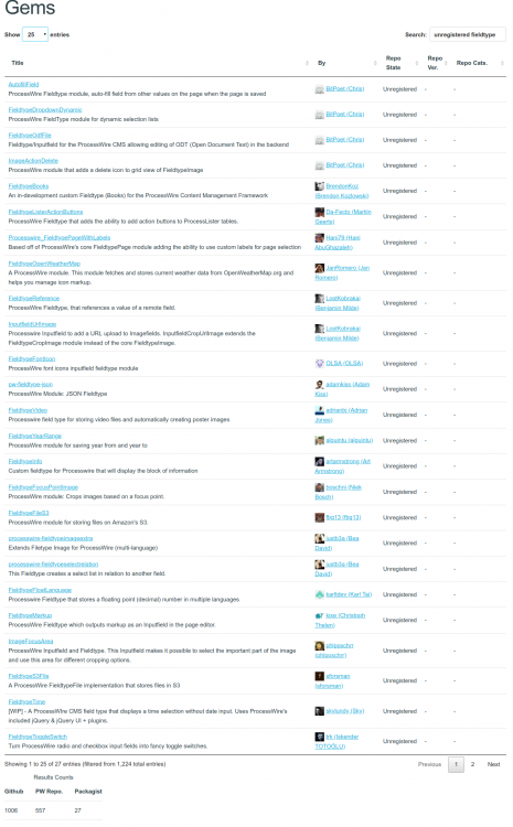 Hi Robin, I originally envisioned PW Gems as casting a wider net than it currently does, with search methods for additional PW sources including Google, github gists, code snippets embedded here in forum posts, as well as public gitlab and bitbucket repos. I only got around to doing the PW repo, github and packagist searches in the end and, of these, only the PW Repo search extracts version information. There's no reason these searches couldn't dive deeper and look for versions from well known files, but I've not done it. Of course, not all the projects turned up are modules. Many of the repos are people's PW site boilerplates for example, though they may have a published tag or release that contains a version number. -