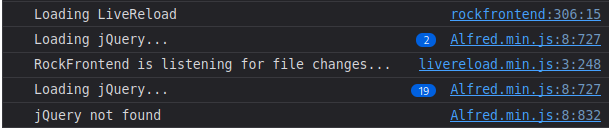 Hi @imandreas Yes, I changed this in _init.php and Alfred now runs as expected. My point is that I think this should be included automatically within the RockFrontend site profile, or be in the RockFrontend documentation for Alfred. Or perhaps the code for Alfred could pop up a JS alert box indicating the need to load JQuery - which would save having to look at the console. $rf->scripts() // load uikit ->add('/site/templates/uikit/dist/js/uikit.min.js', 'defer') // load custom javascript of this project ->add('/site/templates/scripts/main.js', 'defer') // load jQuery from /wire to allow ALFRED testing ->add('/wire/modules/Jquery/JqueryCore/JqueryCore.js', 'defer') // <<< Added // minify on production ->minify($config->debug ? false : true); This is just to get things running for testing - would need to conditionally include it only if alfred is needed.