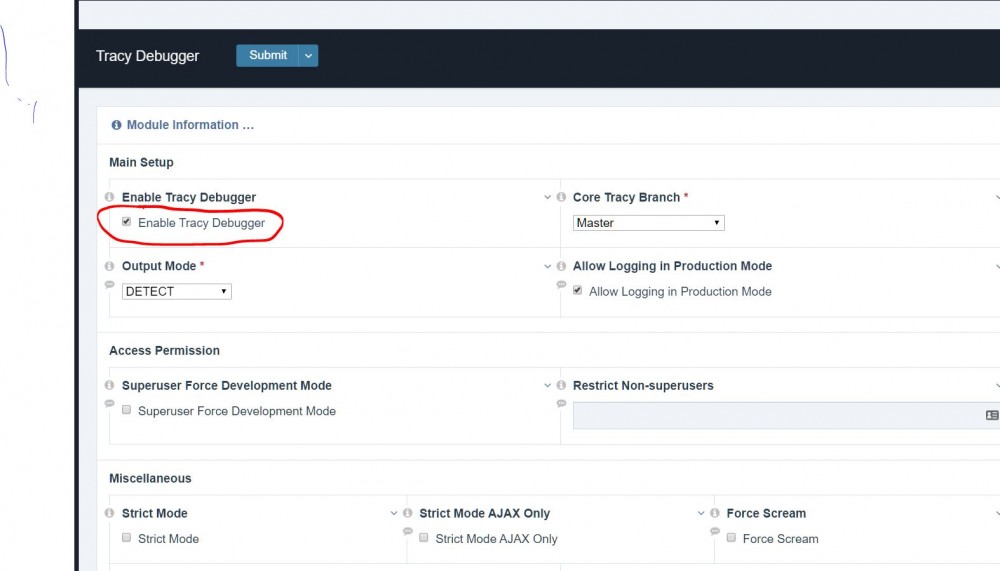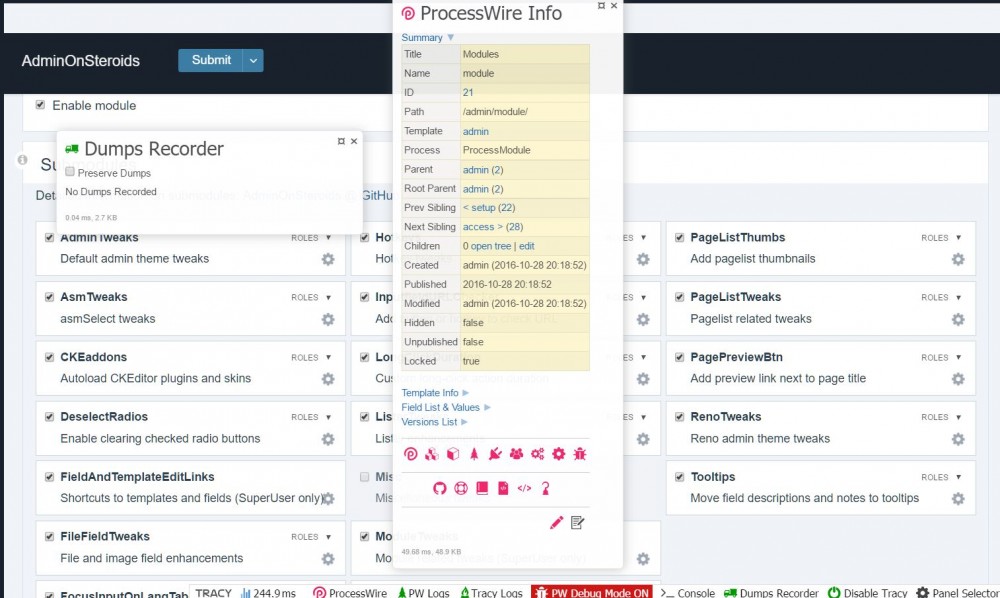 Okay, Tracy Debugger module is installed, I 've uncomment line :913 bd($ckeCSS); and :961 bd($adminCSS); on AdminOnSteroids.module inside .AdminOnSteroids directory.I have read and followed carefully, I understand am supposed to look for debug bar once debugger is installed. Apparently, its not show any bar. I use chrome browser with firelogger installed. Yes, I've confirmed debugger is enabled, The bar to display at front and back is checked, the uncommented, line 913 and 961 and cleared cache after Tracy debugger module is installed. Now I am getting confused... what am I missing?