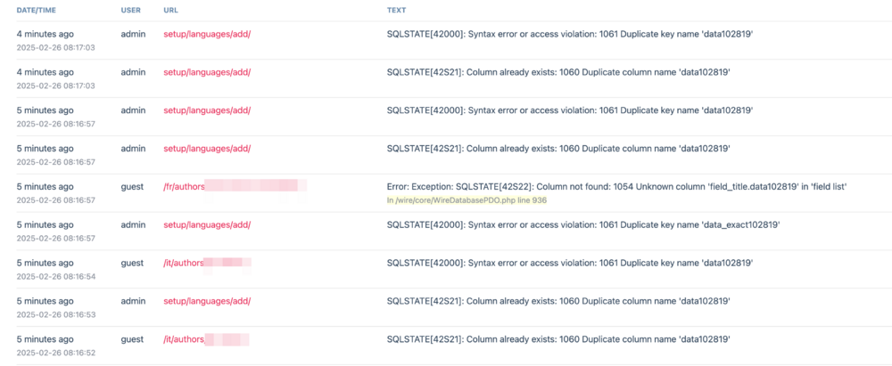 Right, of course. PW 3.0.229 I'm not adding any new module new, just adding a new language "languges -> add new". The site has repeater matrix 0.1.1 installed (I suspect this has something to do with the dynamic field name "data102819") I think I'm mostly looking for some guidance on the underlying data model so I can look if something is seriously wrong or if i can leave this as it is.