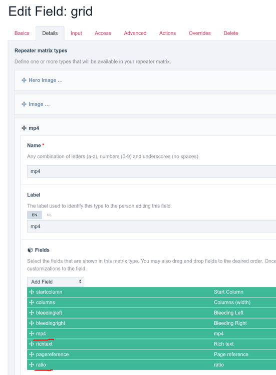 Hello, I'm lost with my Matrix (profield) and how to look for data using selectors: I have a matrix ("grid"), it has a 'matrix repeater type' mp4 that contains the fields 'mp4' and 'ratio' (and others): Under admin / repaters in the backend, things look a bit cryptic: Now, how do I find the mp4s that doesn't have a ratio? I would imagine something like wire('pages')->find("template=repeater_grid,mp4!='',ratio=''"); ..but I can't get any meaningful results back. If I could only get all mp4's, that would already be a good start... many thanks J