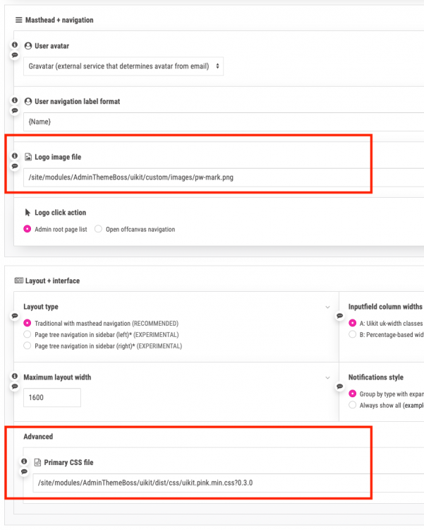Hello Friends… New Version 0.4.0 released. I try to answe a few questions. How the theme works: PATHS ARE OUTDATED - THE CONCEPT MORE OR LESS THE SAME. (will update soon) The variations & Ryans work: It uses the built in uikit feature to create themes. Theme variations can be defined in uikit/themes.json. In my case, I define 3(+1) themes: black, blue and vibrant blue. These relate to "entry points" found under ./uikit/custom/antrypoint.less » like uikit/custom/pw.less or black.less or vibrant.less Each one of these basically only defines the custom accent colors and include all other general variables and some overrides: // uikit source @import "../src/less/uikit.theme.less"; // main accent color: // pw color @theme-primary-color: #3584EA; @theme-primary-color-rgba: rgba(53, 132, 234, 0.6); // Original Theme @import "../../AdminThemeUikit/pw/_import.less"; // AdminThemeBoss Custom Styles @import "fonts/fonts.less"; @import "theme/main.less"; In the newest Version (0.4.0) I actually grab ryans code (uikit and other custom stuff) and include my own customizations (variables etc) after that, this should ensure that the theme stays as compatible as possible. Of yourse if ryan changes major stuff, this needs to be addressed sperately. The Main File is uikit/custom/theme/main.less Ryans stuff can be found under ./AdminThemeUikit/ – it's a copy of the custom folder of his Module. There is a new ./upgrade-theme.sh that automates that stepp… Compiling the css Compiling is done using npm or yarn using webpack from the uikit folder. It's easy: $ cd uikit # grab node modules: $ yarn # compile $ yarn compile-less # or for development: $ yarn watch Injecting the css: Before 0.3.0 I search and replaced Ryans CSS in the html using a hook. Since 0.3.0 i only set parameters of AdminThemeUikit: cssURL and logoURL So no messing arround with unstable HTML… Why not an actual Theme? Tldr; For compatibility & flexibility reasons Longer Version: Because if I make AdminThemeBoss an actual standalone theme, I lose compatibility with Ryans AdminThemeUikit … By only working on top of his theme, all new features he includes will still (and instantly) be working with AdminThemeBoss without an upgrade because my theme is mostly only css. Also, I can not hook into his functions for example to extend the breadcrumb if I build my theme as a standalone theme. Why these color variations? Now there are 4 ? » Black: Because I our basic Corporate Design is mostly black and white » Processwire Blue: Because obvious I it would be cool to retain some relation to PW CD » Bright Blue: To have something fresh and because I like it ? » And a new Happy Pink version because of C43H66N12O12S2
