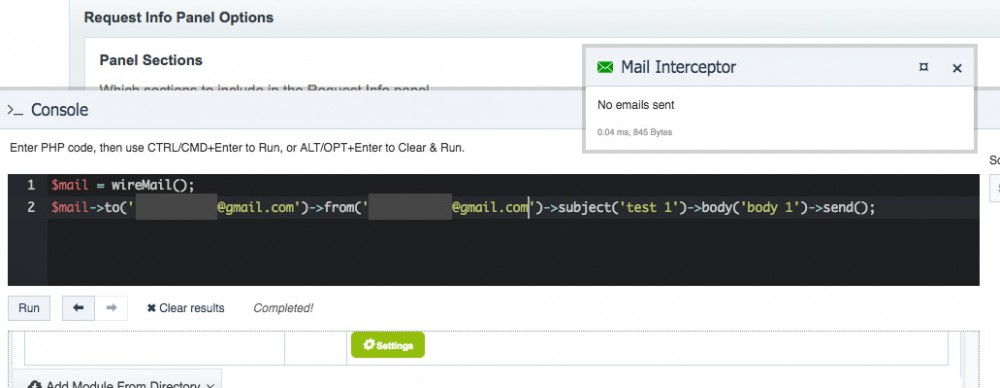 15. Something new happened though when I hit "run" for the email test. The console has a bunch of code there now, I didn't see that before. Actually I guess that's the default behavior for the Page view, earlier I was on the module page itself.