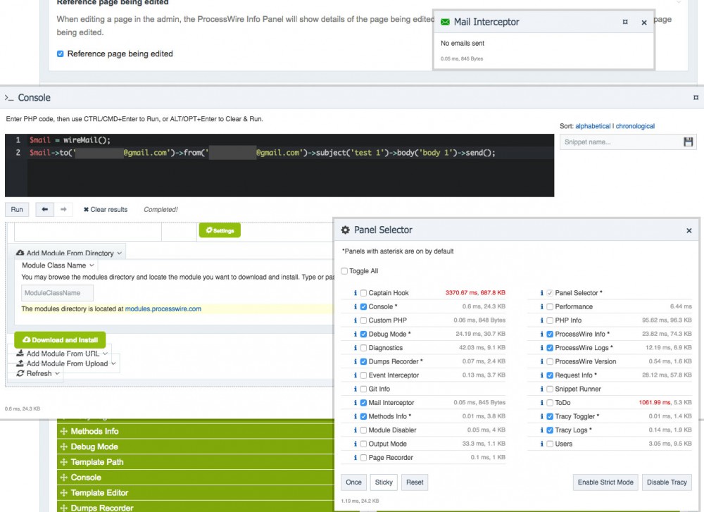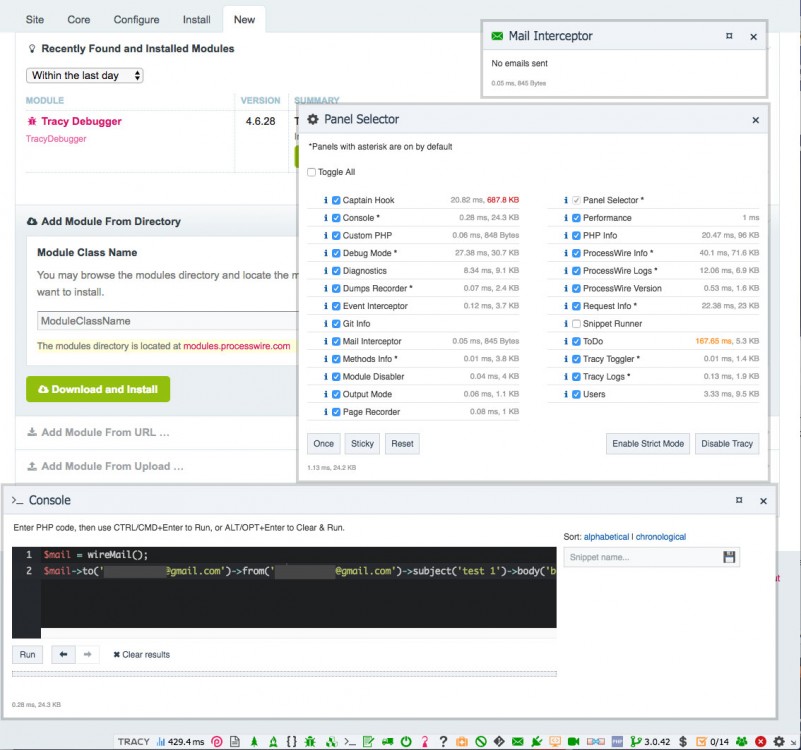 17. Ok, I disabled the snippet runner panel, the errors are gone but no AJAX bar or sent email yet. This is a screenshot of everything I have:
