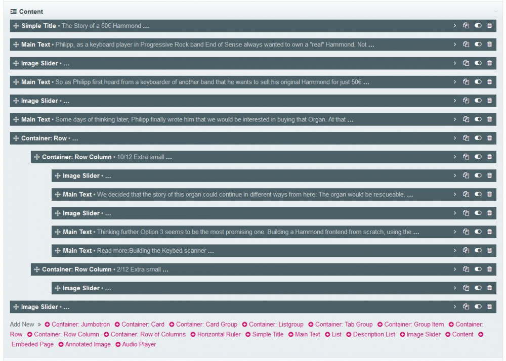 Just wrote the same... ? Sadly the ProFields description currently miss screenshots, so its probably little difficult to get an idea about how RepeaterMatrix works. https://processwire.com/store/pro-fields/repeater-matrix/ With the RepeaterMatrix you basically define a sequence of elements producing content for your page. Each element has one or more field(s) containing stuff like images, text or whatsoever. Items may also have a "depth", which could map to div containers, for example. Here are two screenshots how this may look in the backend: : The second one generates this page: https://www.team-tofahrn.de/en/projects/organ-story/ -