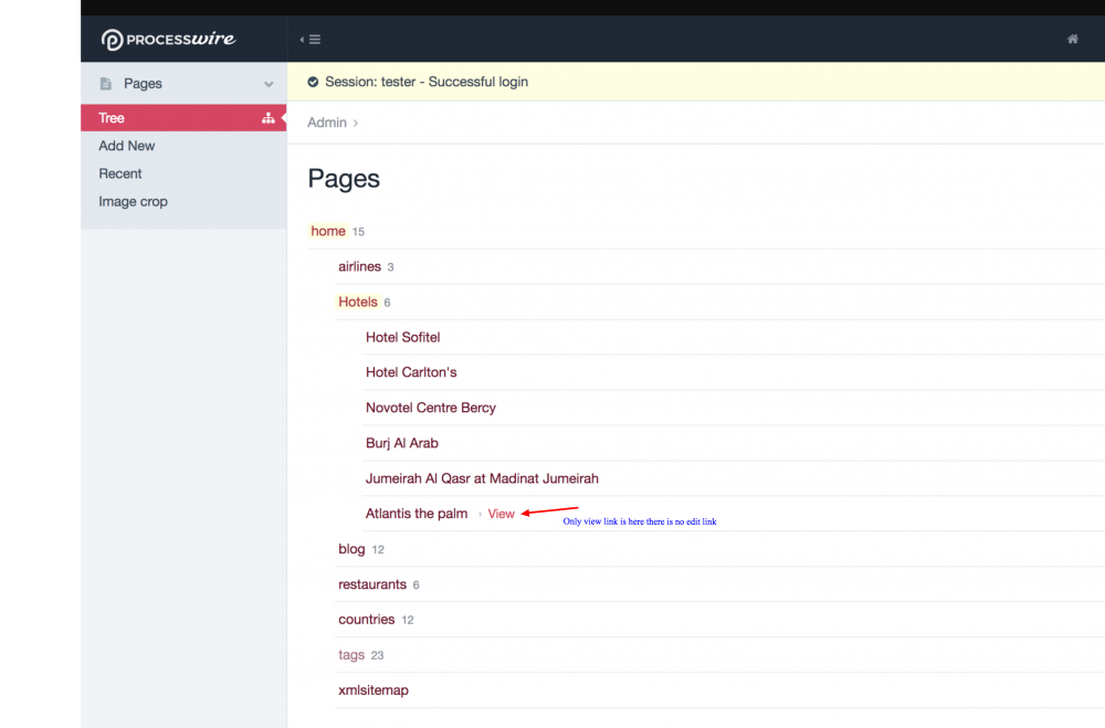 In PW I created a user 'tester' and gave the access to create edit and new. Issue is I'm unable to see 'edit' link in front of each page link and pages that i want to edit is already created. any help in this will be great help. Thank you.