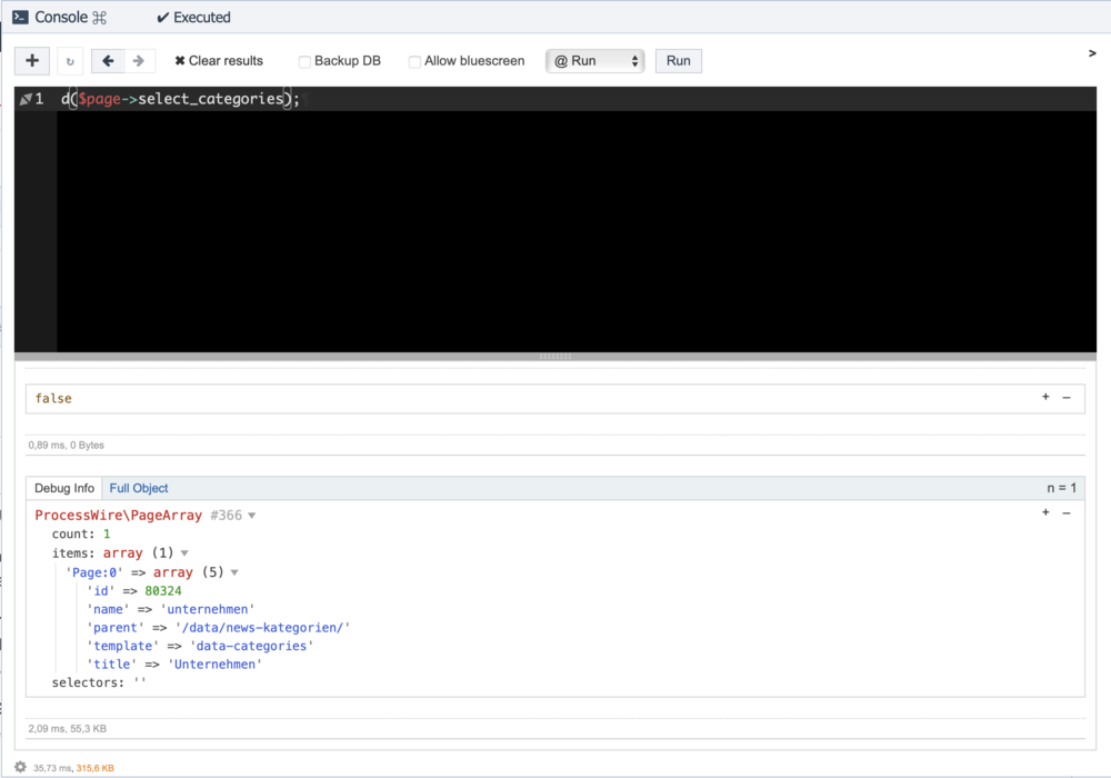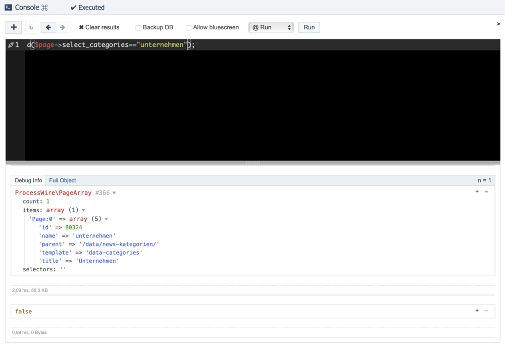 Hi to all, I have a page reference field (select_categories) that references to a page called "unternehmen". When I debug it, PW says that the of the referenced page is "unternehmen". But when I put the condition, I get false. What am I doing wrong?